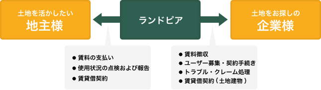 サブリースとは、不動産オーナー様や家主様がお持ちの物件を当社が借り上げ、 利用希望者や入居希望者の方に賃貸する、転貸借制度です。 「土地を活かしたい地主様」と「土地をお探しの企業様」をランドピアが仲介いたします。